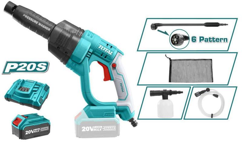 Total TPWLI2008 akkumulátoros nagynyomású mosó, 24,8 Bar, 2,2L/perc, nem tartalmazza az akkumulátort és a töltőt Jellemzők: Feszültség: 20 V; Maximális nyomás: 24,8 Bar; Áramlási sebesség: 2,2 l/perc; Automatikus kikapcsolás; Akkumulátor és töltő nem tartozék.